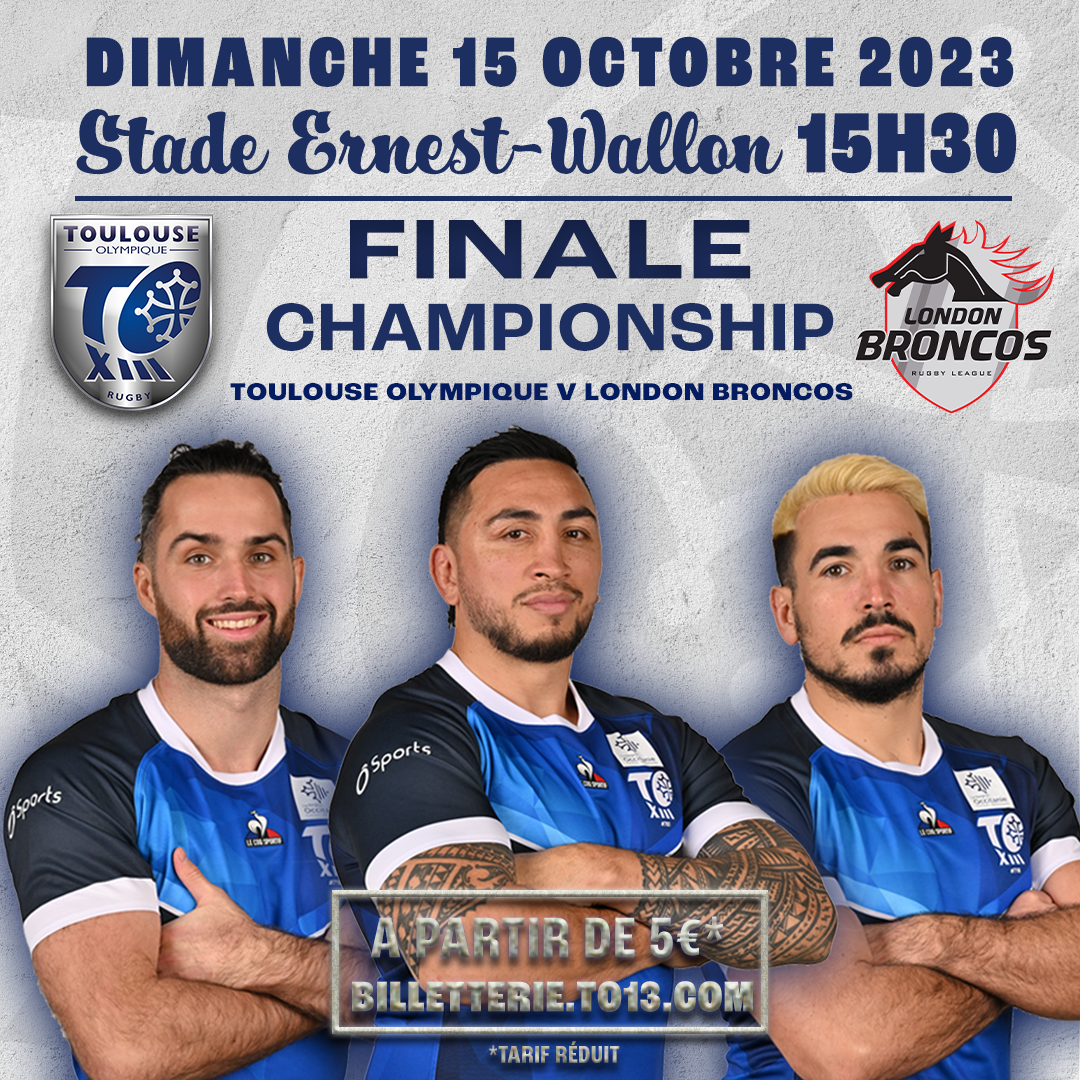 C’est désormais officiel le Toulouse Olympique recevra les London Broncos au Stade Ernest-Wallon pour la finale du Championship 2023, le dimanche 15 octobre à 15h30. Ouverture des portes à 13h30. Les places sont désormais disponibles à la vente.