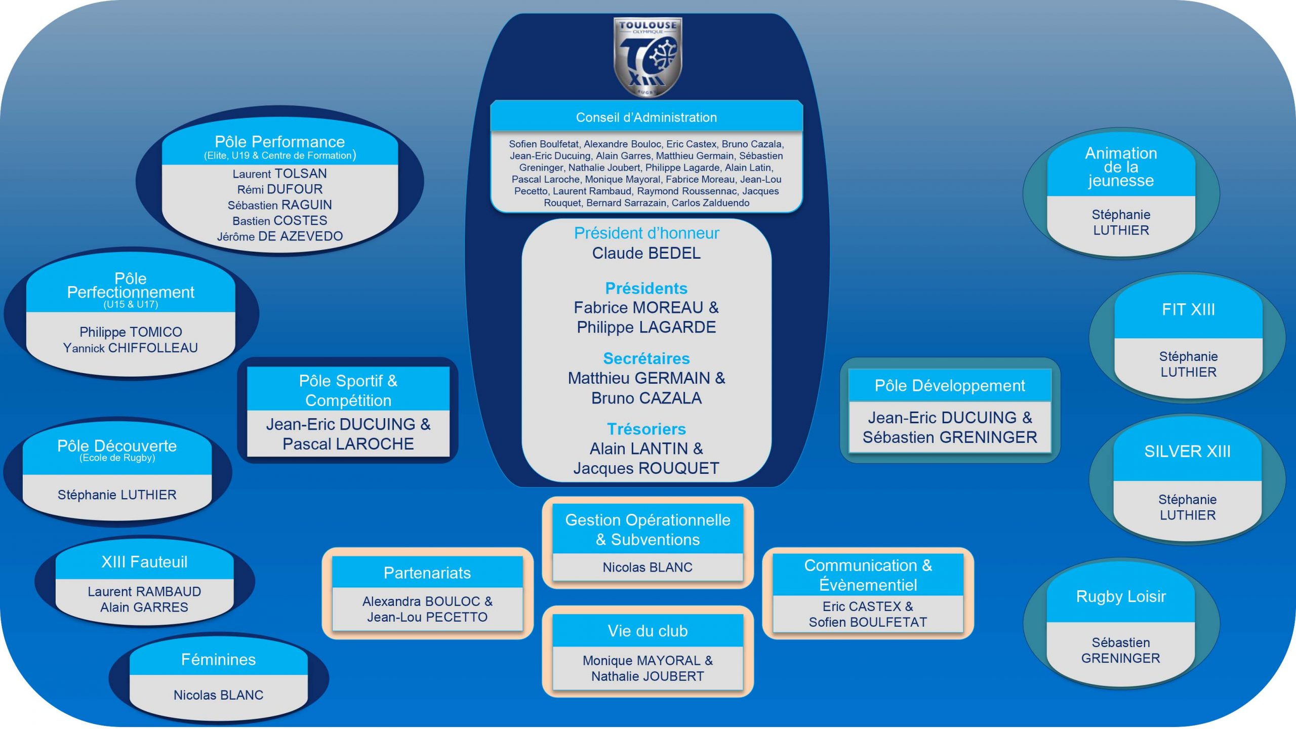Suite aux dernières élections, l’association du Toulouse Olympique XIII a défini un nouvel organigramme afin d’assurer son bon fonctionnement.