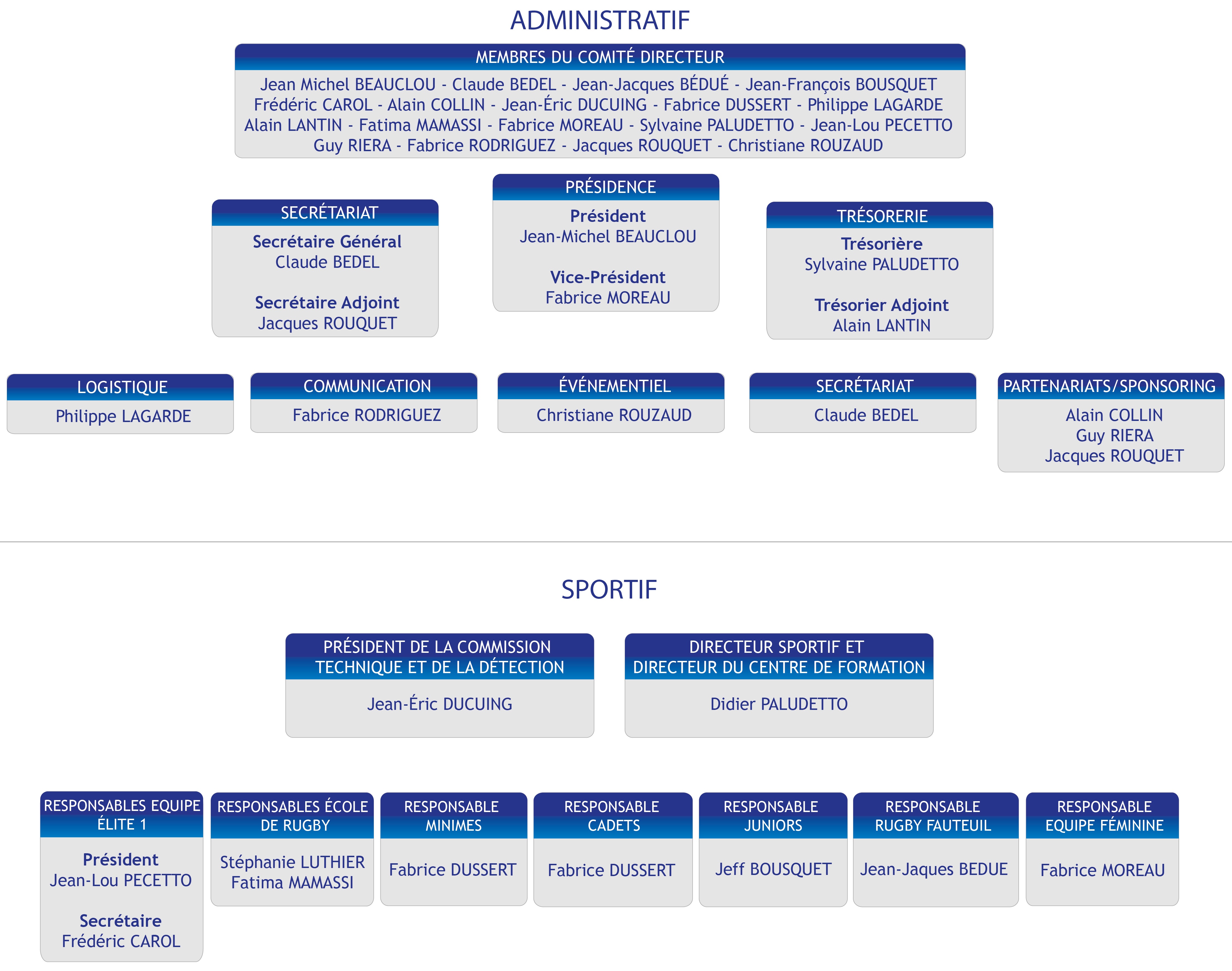 Suite aux élections qui ont eu lieu au début du mois de juin, un nouveau Comité Directeur a été choisi à la tête de l’entité associative du Toulouse Olympique XIII, dont l’organigramme se trouve ci-après.