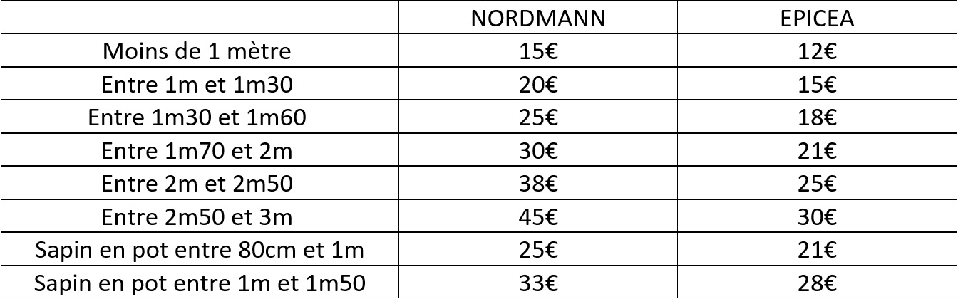 Plusieurs tailles de sapins vous sont proposées, à des prix plus qu’attractifs. A noter que ces arbres sont livrés sans base (bûche), qu’il est possible de commander séparément (3€) :