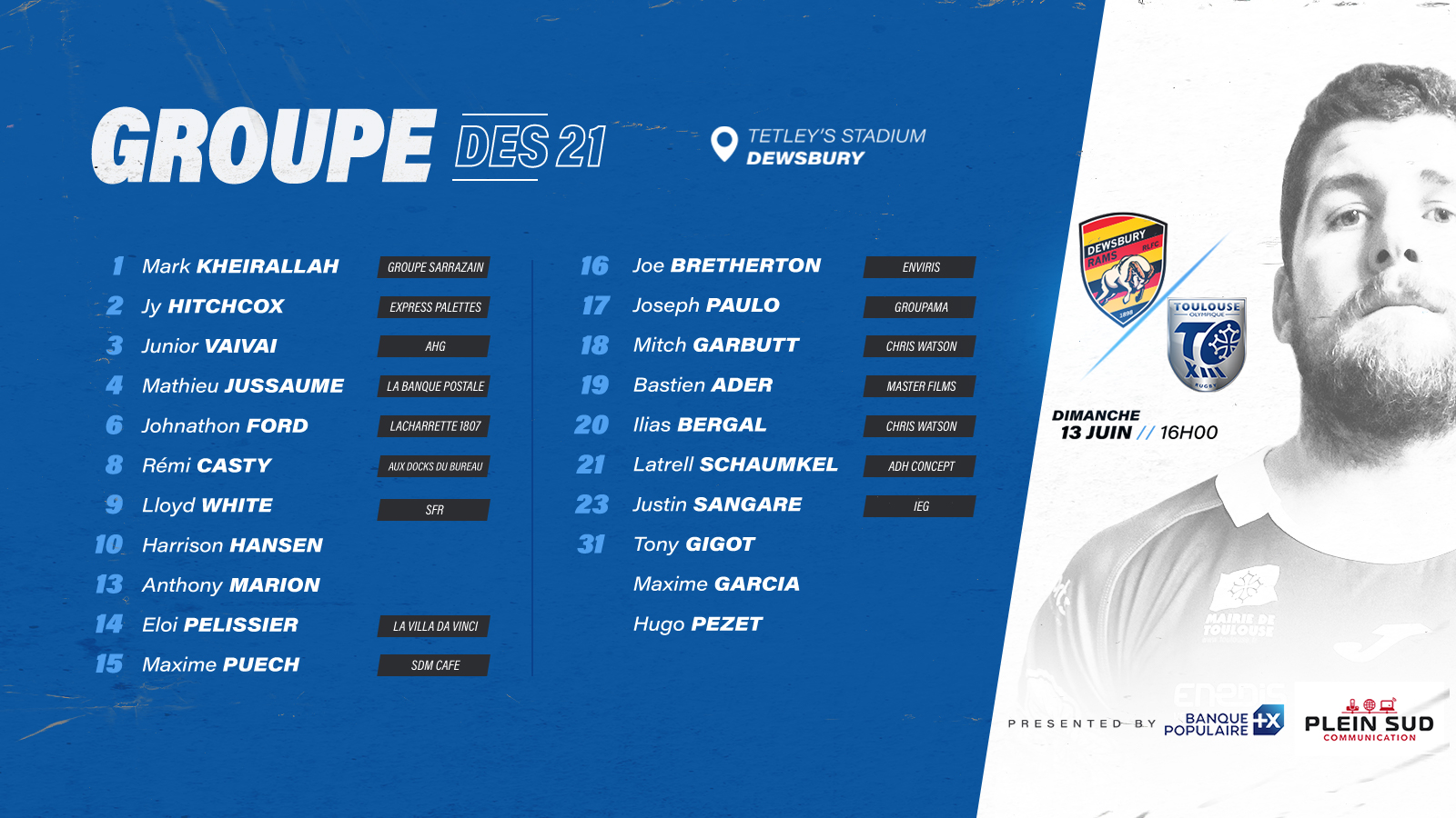 Voici le groupe du Toulouse Olympique XIII retenu pour le match face à Dewsbury, ce dimanche (13/06) pour le round 9 de Championship. Coup d’envoi à 16h (heure française).