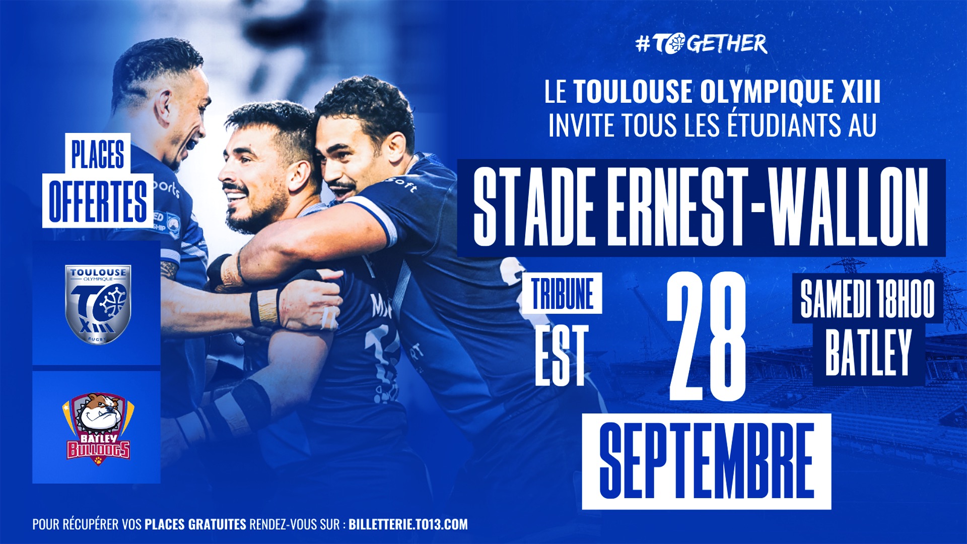 Le procédé change, mais reste tout aussi simple ! Il suffit de se rendre sur billetterie.to13.com, sélectionner le match TO XIII v Batley Bulldogs et de choisir le tarif ETUDIANT. Un justificatif (carte étudiant ou certificat de scolarité) est obligatoire pour rendre votre place valide lors de votre arrivée à Ernest Wallon. Les personnes ayant envoyé un mail pour leur place au préalable n’ont pas besoind’effectuer ce process, leur demande a été prise en compte.