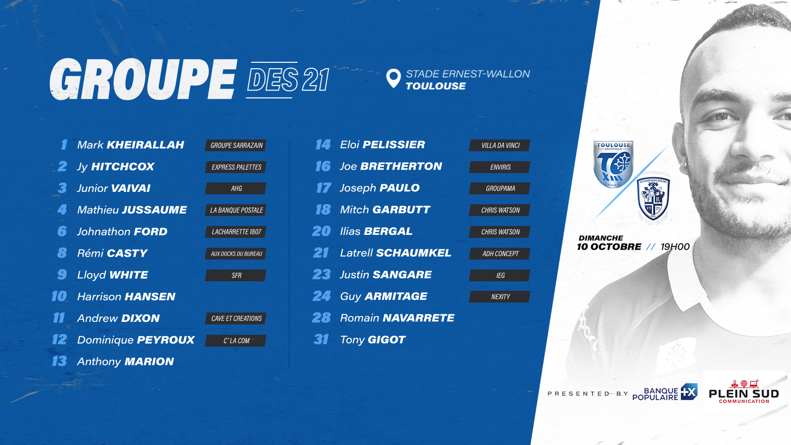 Voici le groupe du Toulouse Olympique XIII retenu pour la finale d’accession à la Super League face à Featherstone ce dimanche 10 octobre. Coup d’envoi à 19h.