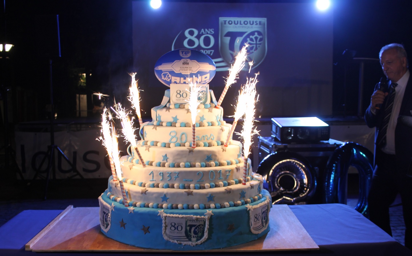 Et un anniversaire ne serait pas un anniversaire sans gâteau. Ce dernier, bleu et blanc bien entendu, a été présenté tout feu tout flamme à l’assemblée avant d’être symboliquement coupé par le Président SARRAZAIN et son prédécesseur Carlos ZALDUENDO. C’est ainsi que s’est achevée cette belle soirée, une première célébration des 80 ans du TO XIII des plus réussies avant d’autres à venir !