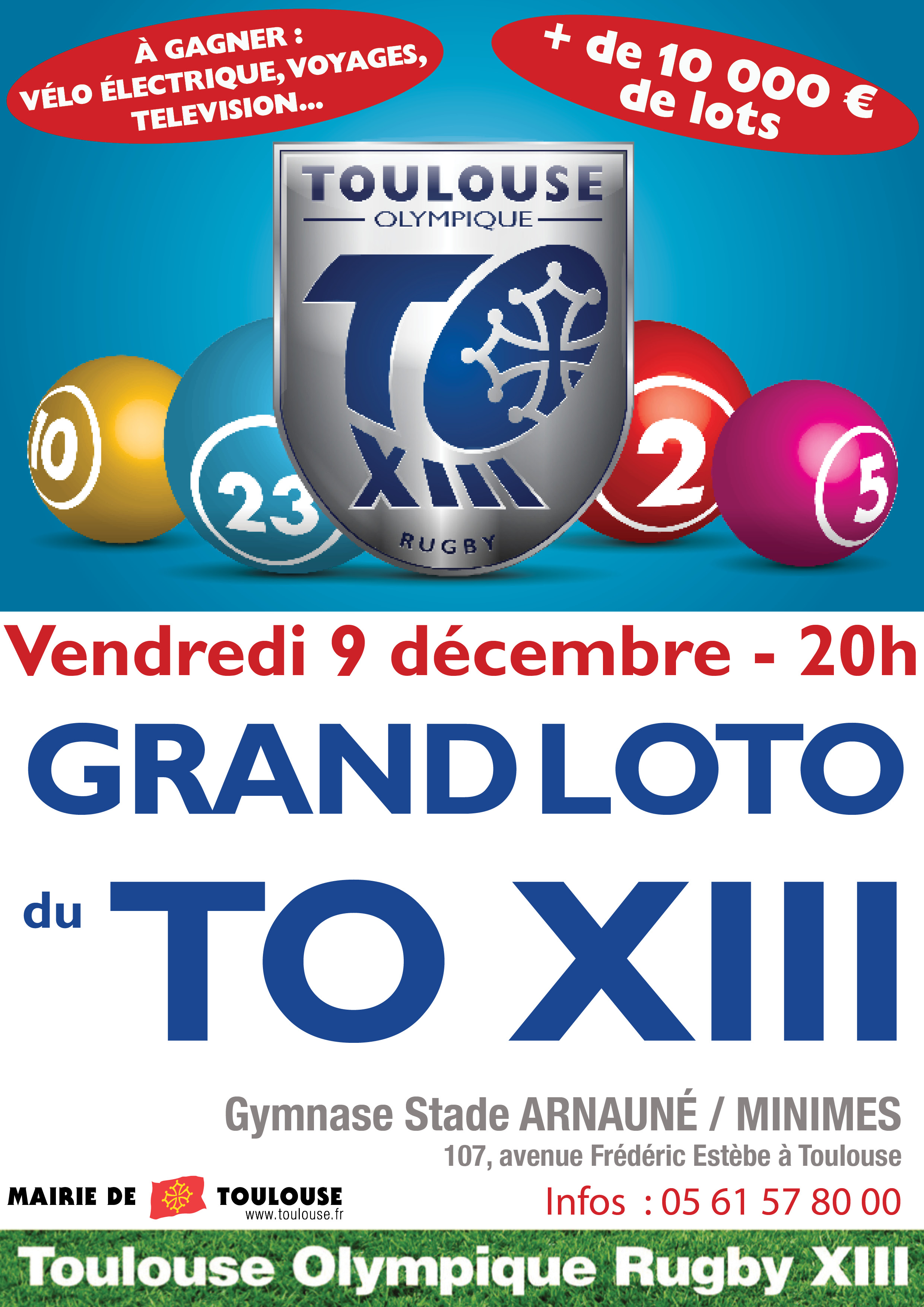 Le vendredi 9 décembre 2016 à 20h, le Toulouse Olympique XIII organise son grand loto annuel dans le gymnase du complexe Arnauné, au cœur du quartier des Minimes (107 Avenue Frédéric Estèbe – Toulouse).