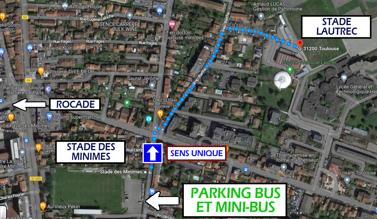 Cependant, TOUS LES BUS ET MINI-BUS devront stationner sur le parvis du stade des Minimes (107 Avenue Frédéric Estèbe 31200 Toulouse) à 500m à pied du complexe sportif Toulouse Lautrec. Le plan d’accès est disponible ici.