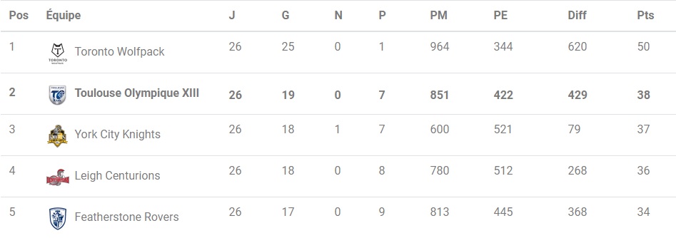 Les 5 équipes qui se disputeront la montée en Super League sont désormais connues mais se tiennent dans un mouchoir de poche (hors Toronto). Le classement final, déterminant les confrontations, ne sera donc définitif qu’après les matchs du week-end prochain. Forts de leurs succès acquis à la maison contre Dewsbury, couplé à la défaite à domicile de Leigh contre York dimanche (01/09), les Toulousains sont seuls deuxièmes mais restent sous la menace des Knights, qui comptent un petit point de moins.