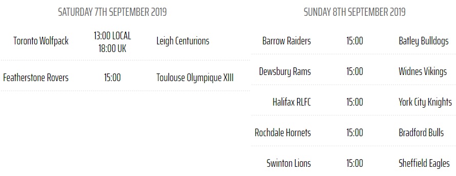 D’un côté Featherstone v TO XIII (samedi 07/09 à 16h en France), où les Olympiens doivent gagner pour ne pas dépendre du résultat de York (à Halifax le dimanche) tandis que les Rovers voudront l’emporter pour tenter de passer devant Leigh (qui se déplace à Toronto).