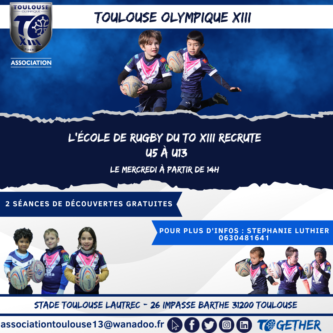 Les jeunes pousses de l’école de rugby du Toulouse Olympique XIII retrouveront les terrains le mercredi 6 septembre pour le lancement de la saison 2023/2024. Et durant tout le premier mois, l’école de rugby propose à tous ceux qui seraient intéressés, garçons et filles, nés entre 2011 et 2020, de participer à deux entraînements découverte !