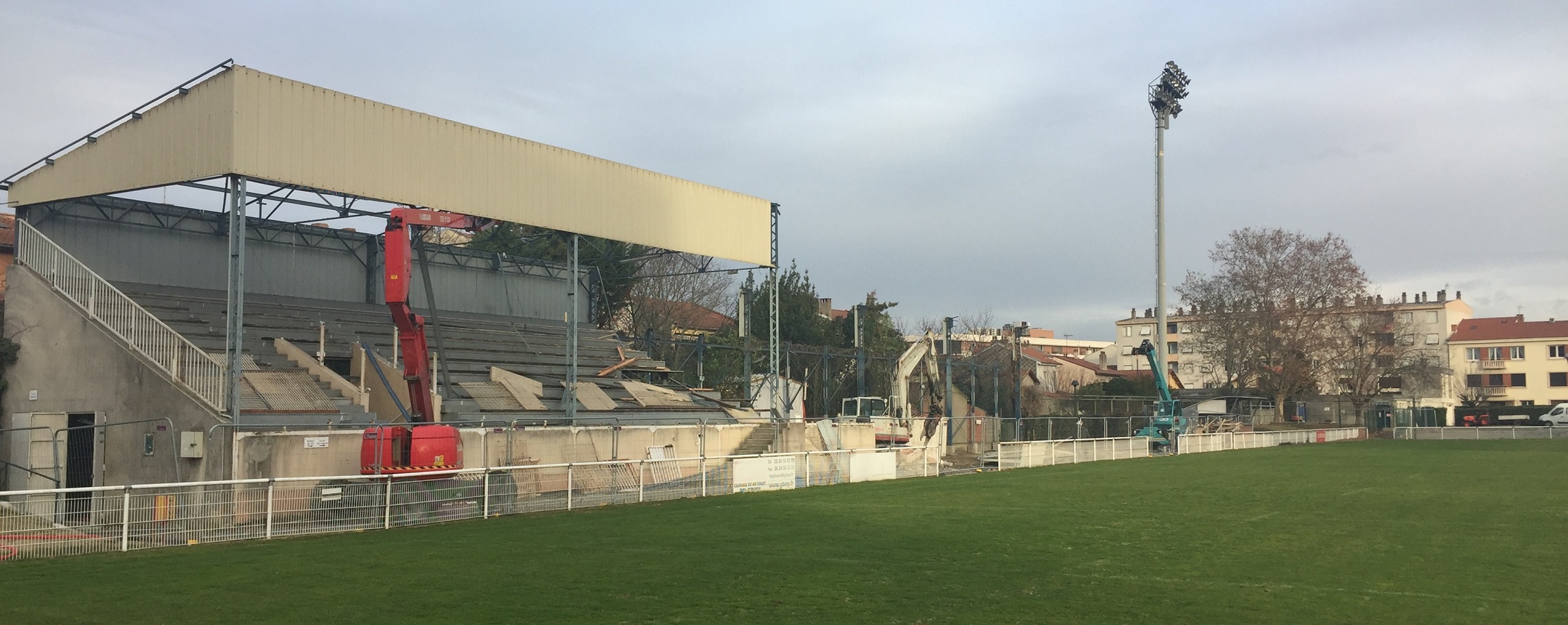 C’est la très vétuste tribune Honneur qui a été la première victime de ce chantier qui devrait durer entre 1 an et demi et 2 ans.