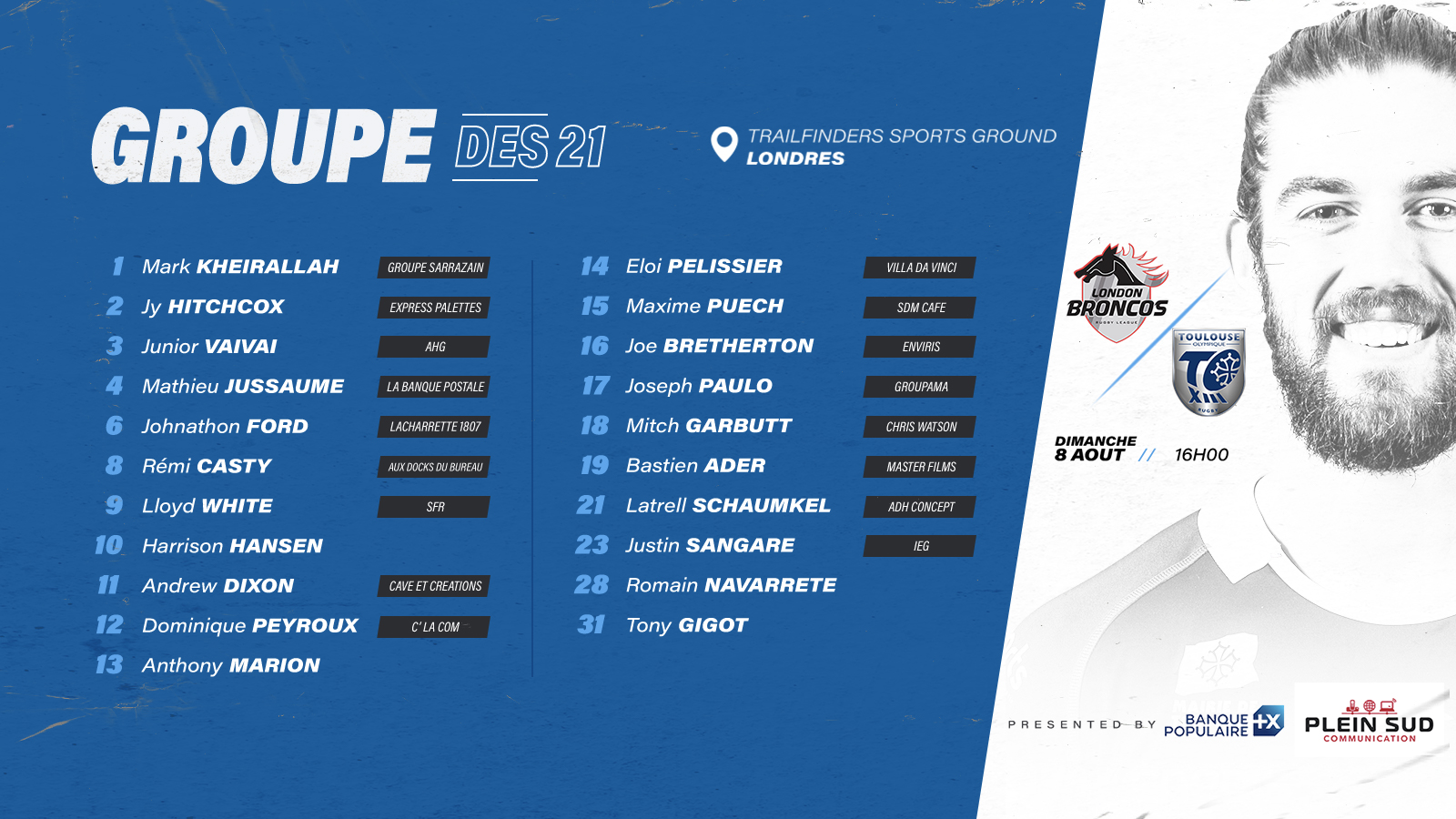 Voici le groupe du Toulouse Olympique XIII retenu pour le déplacement sur la pelouse des Broncos de Londres, ce dimanche (08/08) comptant pour le 16ème round du Championship. Coup d’envoi à 16h (heure française).