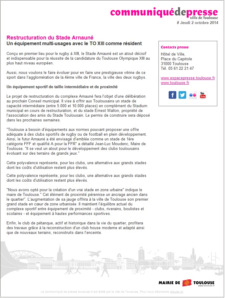 Restructuration du Stade Arnauné – Communiqué de la Mairie de Toulouse