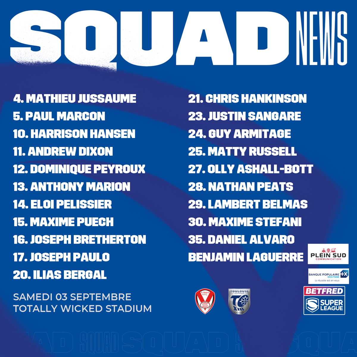 Voici le groupe des 21 joueurs retenus par l’entraîneur Sylvain HOULES pour cette vingt-septième journée de Super League qui marque la dernière rencontre du championnat pour les Toulousains. Les Olympiens se déplacent pour la première fois sur la pelouse du Totally Wicked Stadium. Retrouvez le récapitulatif des forces en présence et les enjeux de cette rencontre ici. Le coup d’envoi est fixé à 16h (heure française).