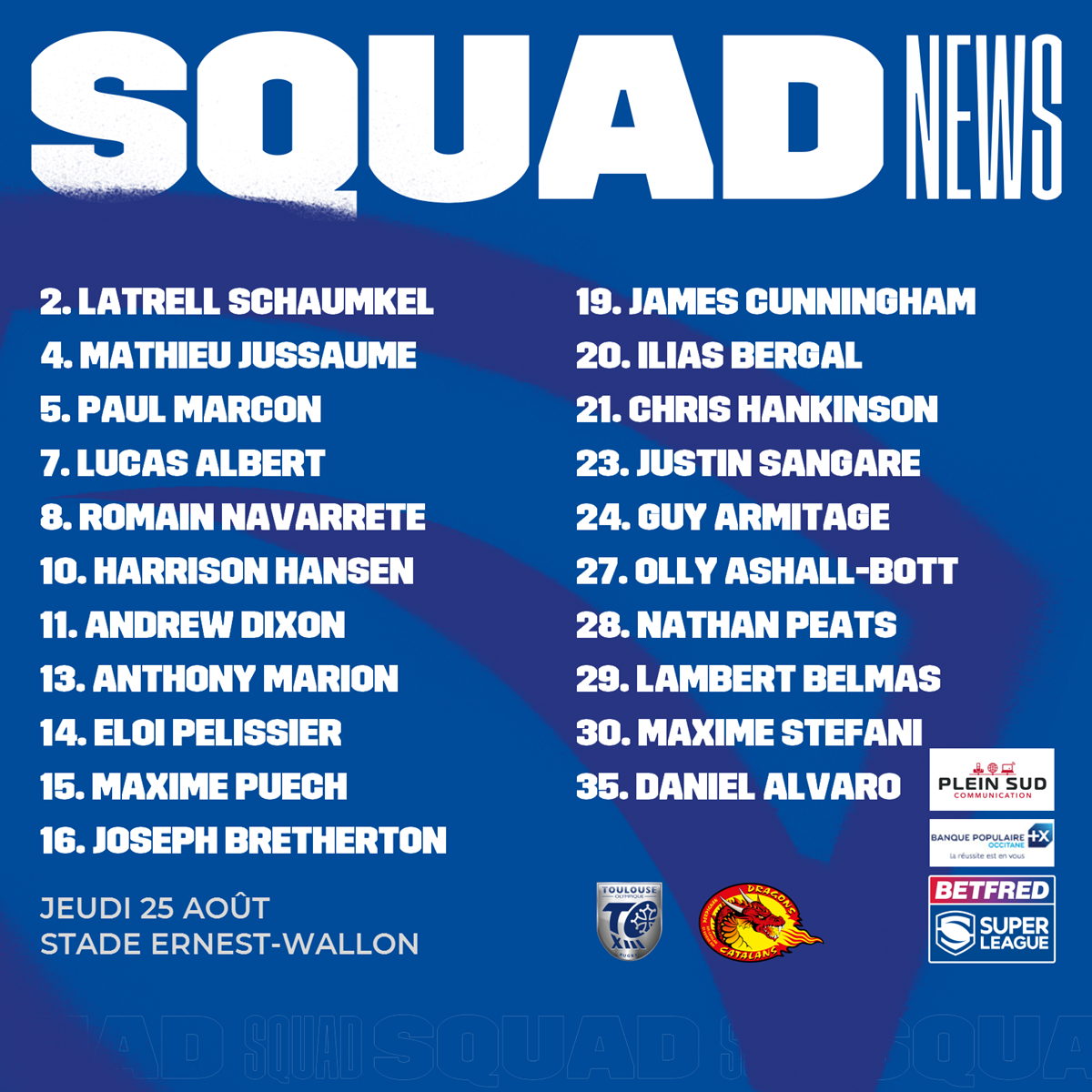 Voici le groupe des 21 joueurs retenus par l’entraîneur Sylvain HOULES pour cette vingt-cinquième journée de Super League qui marque notamment le derby 100% français de la compétition. Les Olympiens recevront donc, sur leur terrain d’Ernest Wallon, les célèbres Dragons Catalans.