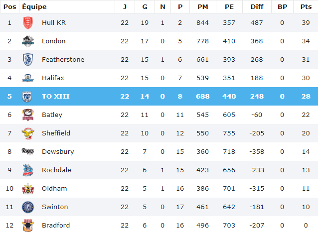 Le TO XIII s’est sorti de la spirale négative dans laquelle il était englué de la plus belle des manières : en infligeant au leader Hull KR sa première défaire de la saison à Craven Park. Le club Olympien pointe à la 5ème place du classement, avec 2 points de retard sur Halifax.