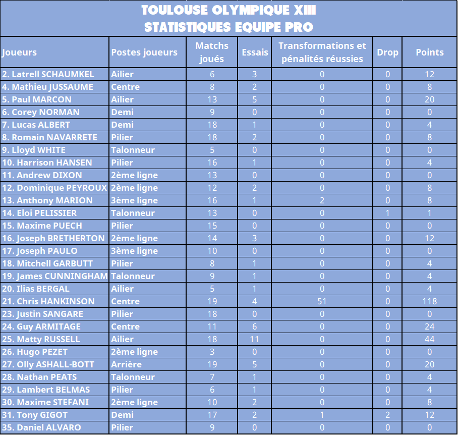 - Les Olympiens ont inscrit 57 essais depuis le début du championnat. Le meilleur marqueur reste l’ailier Matty RUSSELL avec 11 réalisations à son actif.