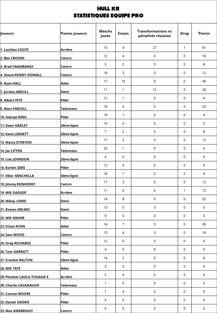 - Hull KR compte 6 637 plaquages depuis le début de la saison. Le meilleur plaqueur de l’équipe est leur talonneur Matt Parcell (619).