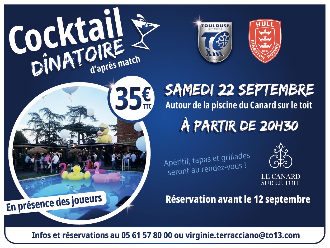 Le club Olympien organise chez son partenaire le Canard sur le Toit un cocktail d’après-match pour célébrer la fin de la saison à l’occasion de l’affiche au sommet Toulouse Olympique-Hull KR (Super League) le samedi 22 septembre, en présence des joueurs du TO. Ouvert à toutes et à tous !