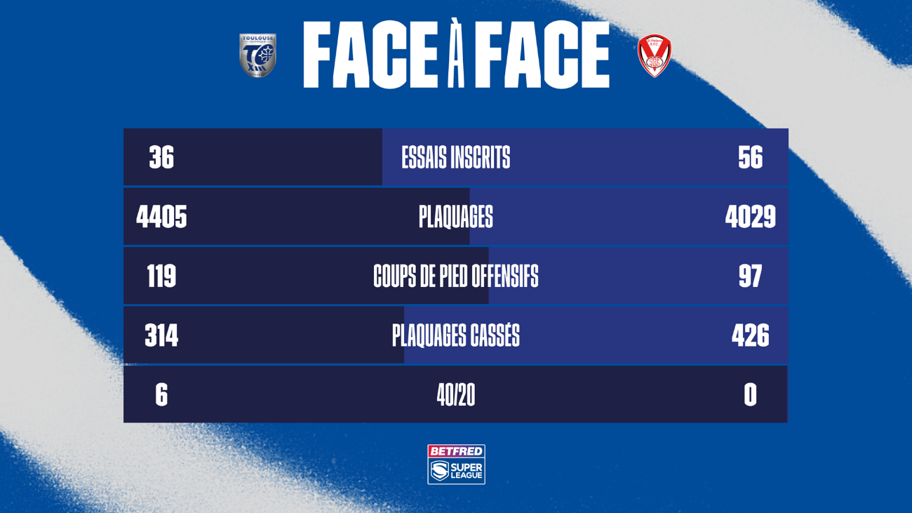 - Avec 314 plaquages cassés le TO est 10e au classement, néanmoins l’ailier écossais Matty RUSSELL est le meilleur franchisseur de Super League avec 64 plaquages cassés.