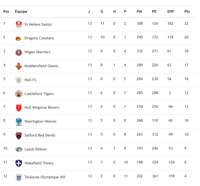Le classement à l’issue de la treizième journée de Super League