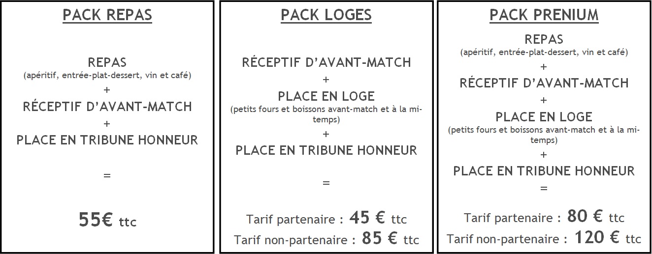 RAPPEL : Pour les abonnés ou les personnes déjà détentrices de place qui souhaiteraient participer au repas d’avant-match, le prix du repas seul est à 40€.