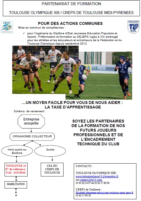 Comme chaque fin d’année, le TO XIII sollicite les entreprises pour le versement de la taxe d’apprentissage au profit du Centre de Formation du Toulouse Olympique XIII. Grâce aux fonds récoltés l’année écoulée, le TO a pu conforter le déploiement des formations proposées aux stagiaires en partenariat avec le CREPS. Le club tient d’ailleurs à remercier toutes les sociétés qui ont contribué à cet essor.