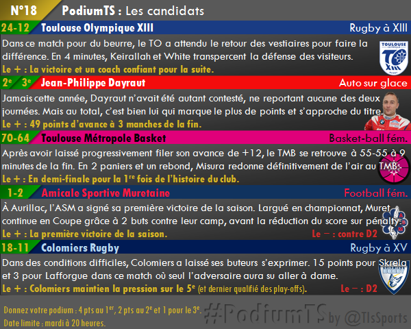 A vous de rédiger simplement un tweet commençant par « @TlsSports #PodiumTS » et de donner ensuite les trois équipes qui méritent selon vous d’être sur le podium : 1er TO, 2e …, 3e…. Attention, seuls les podiums complets seront comptabilisés et la clôture des votes est fixée pour ce mardi (28/01) 20 heures. A vous de voter rapidement !