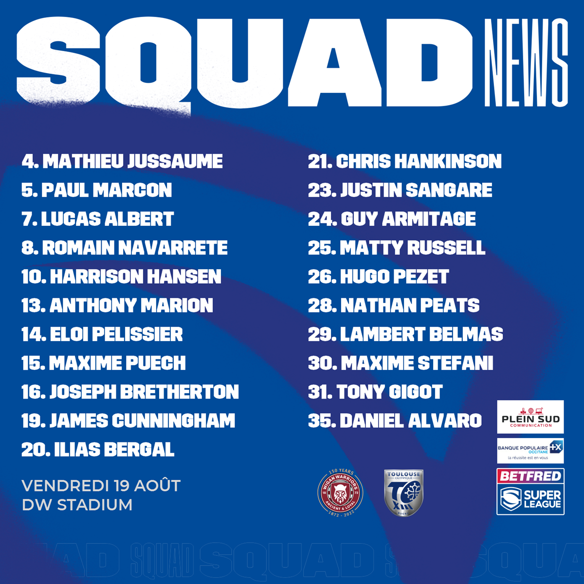 Voici le groupe des 21 joueurs retenus par l’entraîneur Sylvain HOULES pour la vingt-quatrième journée de championnat, qui verra le déplacement des Olympiens chez les Warriors de Wigan, ce vendredi 19 août, au DW Stadium.