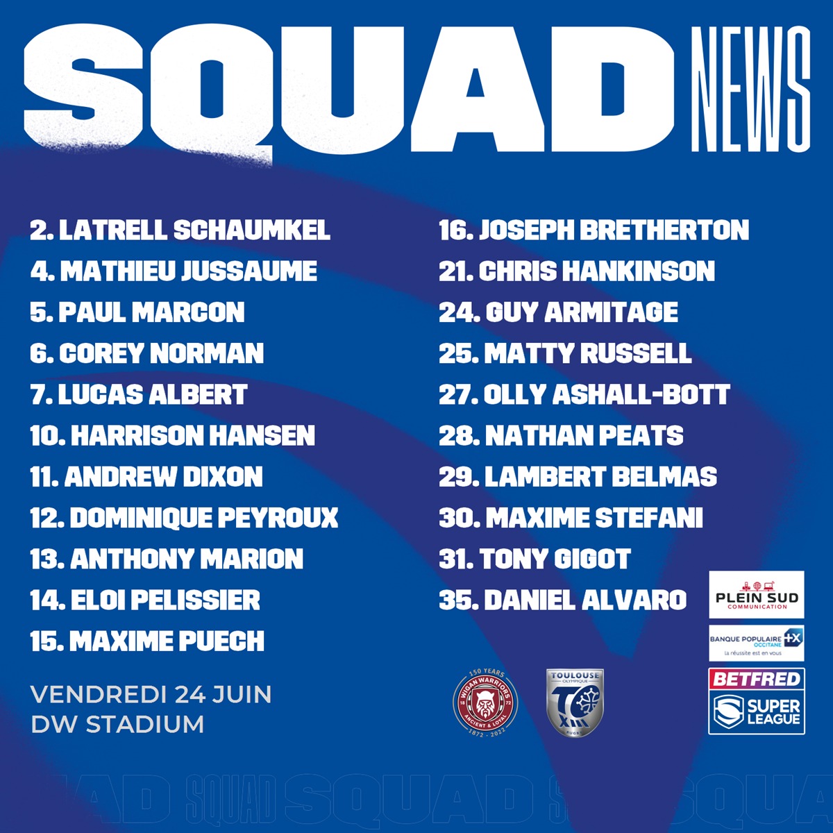 Voici le groupe des 21 joueurs retenus par l’entraîneur Sylvain HOULES pour la seizième journée de championnat, qui verra le déplacement des Olympiens chez les Warriors de Wigan, ce vendredi 24 juin, au DW Stadium. Retrouvez le récapitulatif des forces en présence et les enjeux de cette rencontre ici.