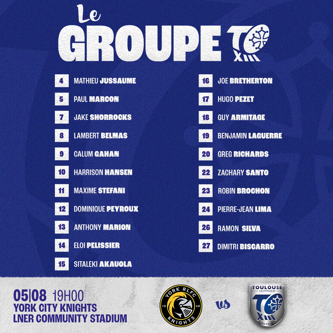 Sylvain HOULES et son staff dévoilent le groupe des 21 joueurs convoqués lors du déplacement chez l’une des équipes en forme (série en cours de 4 victoires d’affilée en championnat), les York City Knights pour le compte de la vingt-et-unième journée de Championship. Coup d’envoi ce samedi 5 août à 19h (heure française) au LNER Community Stadium.