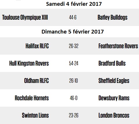 Dans les autres matchs, Hull KR a dominé les Bradford Bulls (54-34) tandis que Featherstone a déjà frappé un grand coup en l’emportant sur le terrain d’Halifax (26-32). L’autre victoire à l’extérieur, elle est à mettre à l’actif de Londres, à Swinton (23-26).