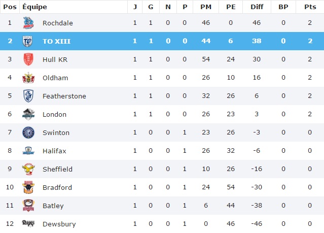 Sheffield, qui recevra le TO lors de la prochaine journée (dimanche 12/02 à 17h30, heure locale), s’est incliné de son côté sur la pelouse d’Oldham (26-10).