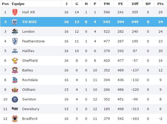 Devant à la pause (16-0), Featherstone s’est finalement fait rejoindre par Hull KR et les 2 équipes ont été contraintes de partager les points (20-20). L’autre choc de la journée entre Londres et Halifax a en revanche tourné à l’avantage des hommes de la capitable -(34-6). Les Broncos sont deuxièmes ex-aequo avec le TO, solide vainqueur à Batley (20-28).
