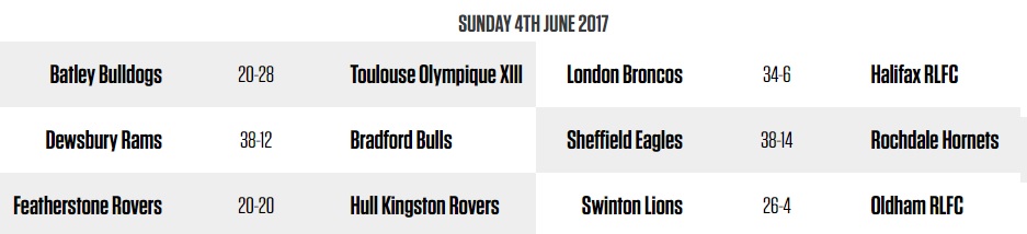 Dans les autres matchs, Dewsbury remporte une seconde victoire de rang, contre Bradford (38-12), Sheffield domine Rochdale (38-14) et Swinton sort vainqueur de sa confrontation avec Oldham (26-4).