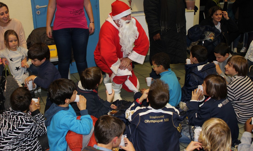 Mercredi 17 décembre, les 103 enfants de l’école de rugby du Toulouse Olympique, et leurs éducateurs, dont les joueurs de l’équipe première, ont reçu la visite du Père Noël. Pas d’entraînement de prévu cette après-midi là, mais il y avait bien rendez-vous dans le Club House du TO.