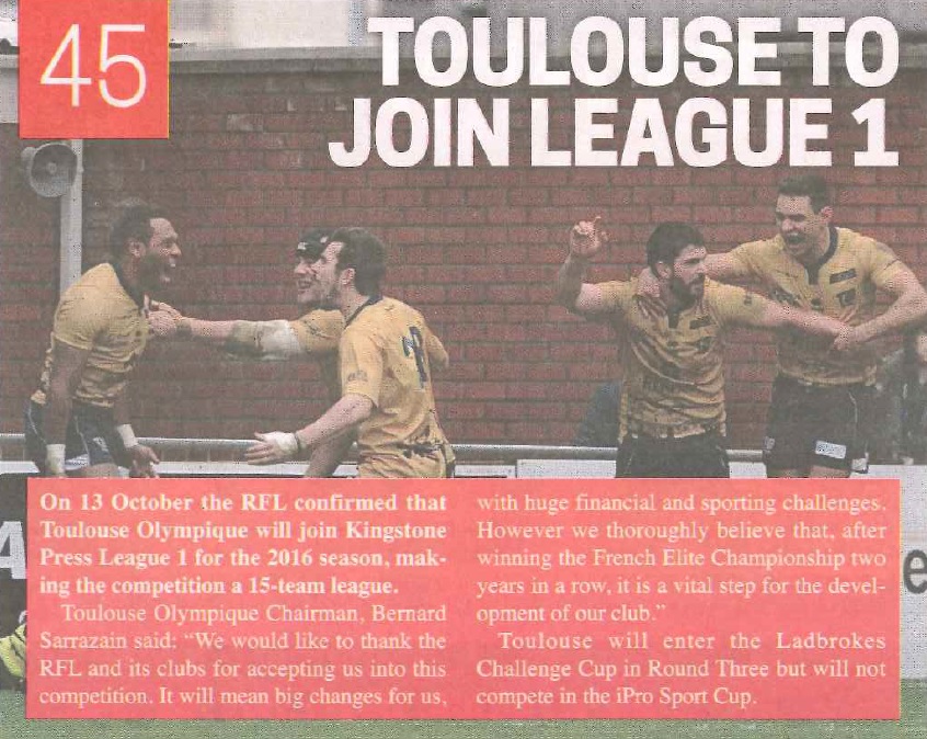 Ainsi, le Toulouse Olympique se retrouve classé à la 45ème place de ce classement avec son intégration en Kingstone Press League One lors de la saison 2016.