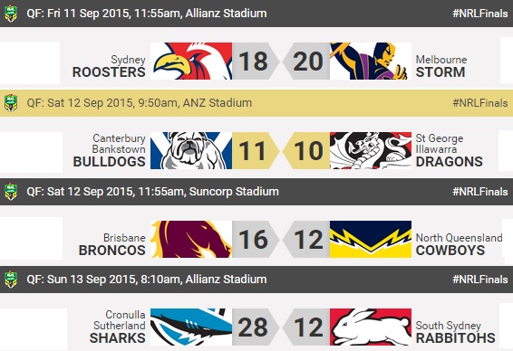 Surprise en revanche avec les Roosters qui se sont inclinés à domicile face au Storm (18-20), tandis que Brisbane a fait respecter la hiérarchie face à la formation du North Queensland (16-12). Roosters et Cowboys devront donc passer par des barrages pour espérer atteindre les demi-finales.
