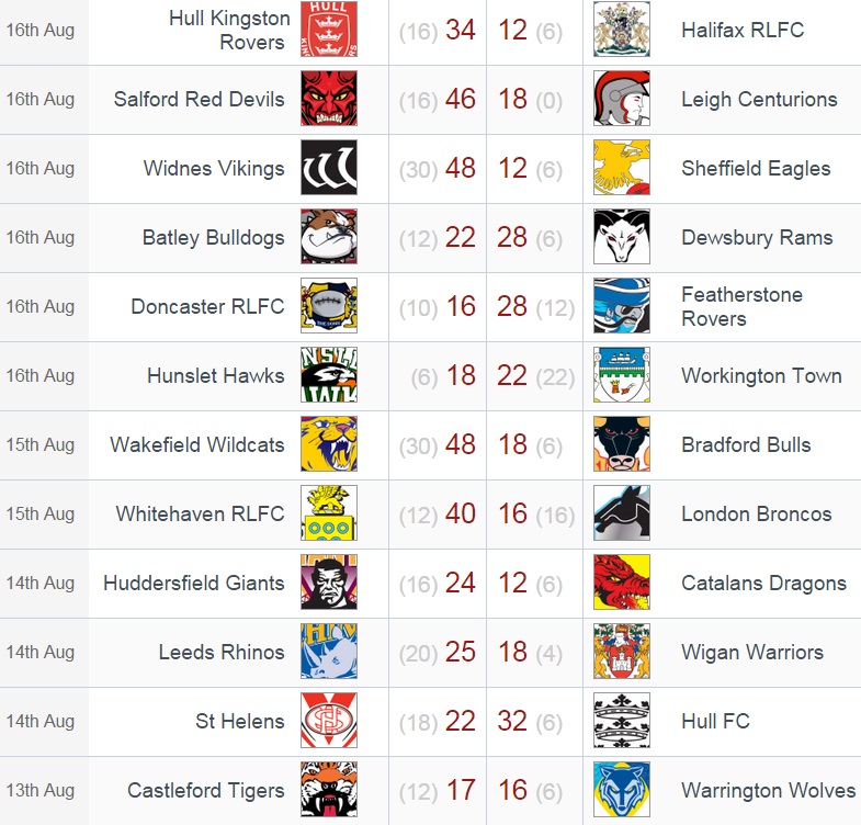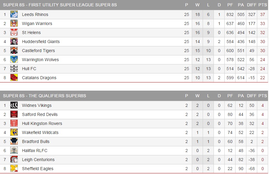 Du côté du haut du tableau, Leeds prend une sérieuse option sur la première place grâce à sa victoire sur Wigan (2ème), combinée à la défaite surprise à domicile de Saint Helens (3ème) face à Hull FC.