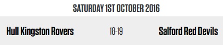 Samedi, Hull KR était opposé à Salford au Lightstream Stadium de Hull. Menés dans les dernières minutes, les Red Devils sont parvenus à arracher le nul et donc le point en or dans les ultimes instants du temps réglementaire. Un drop de 40 mètres de Gareth O’BRIEN a ensuite donné la victoire à Salford, condamnant les Rovers à jouer en 2017 en Championship, où ils retrouveront le TO XIII !
