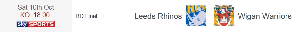 Dans un stade d’Old Trafford archi-comble, Rhinos et Warriors s’affronteront pour la première fois en finale depuis 1998 (remportée par Wigan). C’est la troisième fois consécutive que Wigan jouera cette rencontre décisive (vainqueur face à Warrington en 2013 mais battu par St Helens l’an passé) alors que Leeds est de retour dans le « Théâtre des Rêves » pour la première fois depuis 2012. Les Wiganers ont l’occasion de remporter leur 4ème championnat de leur histoire, mais les Loiners jouent pour devenir l’équipe la plus titrée de cette compétition (6 trophées remportés pour le moment, à égalité avec St Helens) mais surtout réalisé le doublé Cup/Super League, ce qui serait une première pour ce club.