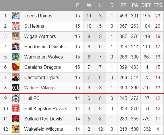 Ainsi, les Red Devils profiteraient bien de leur opposition contre Widnes pour revenir à hauteur de leur adversaire du jour au classement. Dans la foulée, duel fratricide entre les deux clubs originaires de Hull. A égalité de points à l’entrée de la zone ‘rouge’, cette confrontation vaudra très cher : chacun voudra l’emporter pour sortir de cette mauvaise position et enfoncer son alter-ego. C’est un choc au sommet qui viendra clore la journée de samedi (30/05), avec Leeds contre Wigan. Les Rhinos caracolent en tête mais ne doivent pas se reposer sur leurs lauriers sous peine d’une mauvaise surprise car les poursuivants se font pressants, notamment les Warriors (3èmes) qui se verraient bien refaire quelque peu leur retard.