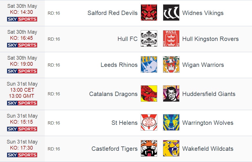 Et ce sont les Dragons Catalans qui rentreront les premiers sur l’habituelle pelouse des Magpies dimanche (31/05), contre Huddersfield. Les Dragons, qui sont sur une bonne dynamique de trois victoires consécutives (dont la dernière contre Wigan), doivent maintenant confirmer à l’extérieur face aux Giants, invaincus depuis 5 rencontres, pour continuer à regarder vers le haut. Autre choc entre cadors ensuite avec St Helens-Warrington. Les Saints tâcheront de faire un résultat pour, au pire, rester au contact des Rhinos, au mieux s’en rapprocher, mais les Wolves lorgnent sur le podium et n’ont pas d’autres choix que de s’imposer pour parvenir à leurs fins. Et pour finir, les malheureux Wildcats (leur dernière victoire remonte au round 3) joueront contre Castleford. Les Tigers ont besoin de points pour s’éloigner de la zone dangereuse, ce qui n’arrange rien aux affaires de Wakefield, mais qui sait, peut être que le contexte les transcendera et leur permettra de renouer avec le succès.