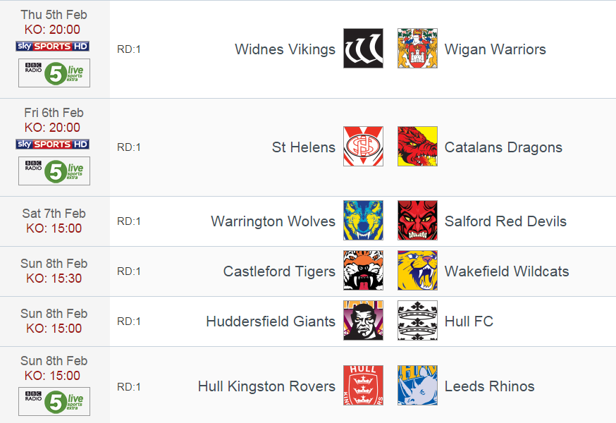 Les trois autres matchs du round auront lieu dimanche (08/02) avec un alléchant derby du West Yorkshire entre Castleford et Wakefield. Les Wildcats qui comptent désormais dans leur rang deux anciens Dragons : Lopini PAEA et Mickaël SIMON. Ensuite, Huddersfield recevra la formation de Hull FC tandis que l’autre équipe de Hull, les Kingston Rovers, la formation de l’ancien toulousain Kevin LARROYER aura fort à faire face à Leeds.
