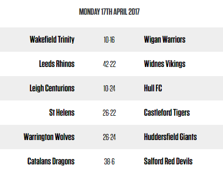 Wigan Warriors s’est imposé à l’extérieur face à Wakefiled Trinity (10-6). De même que Hull FC sur la pelouse des Leigh Centurions (10-24).