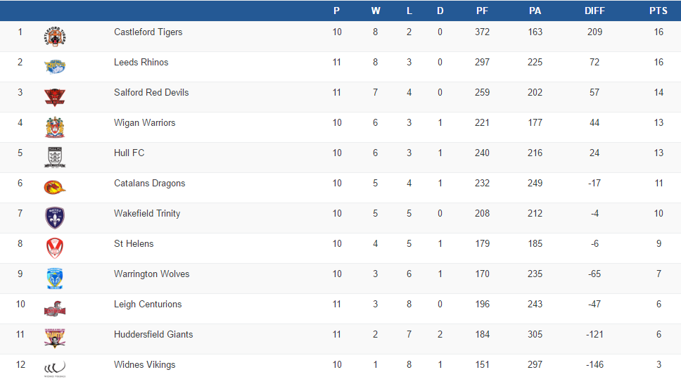 Le leader Castleford est tombé sur la pelouse de St-Helens (26-22). Les Leeds Rhinos réalisent la bonne opération de cette 10ème journée en battant les Widnes Vikings à domicile (42-22) et s’emparent de la deuxième place du classement.