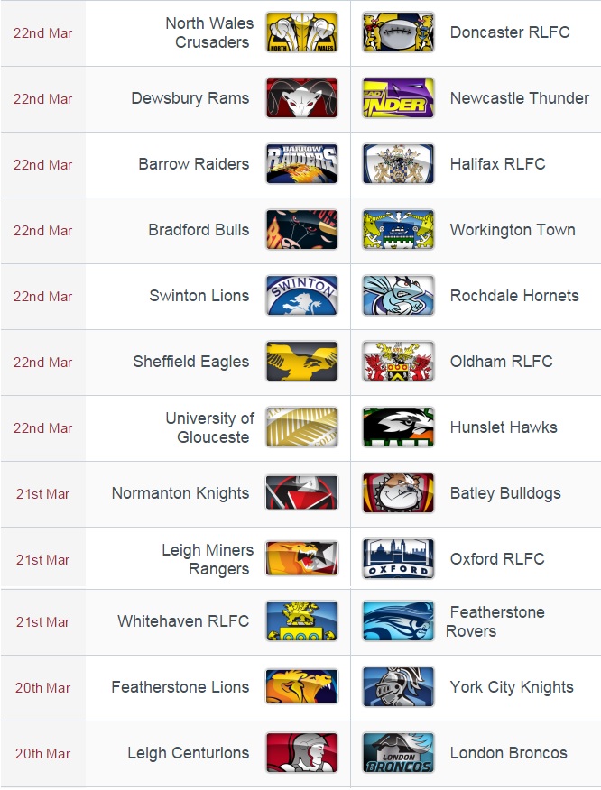 Dimanche (22/03), nouveau derby du Yorkshire Ouest avec Huddersfield-Wakefield. Ces deux formations ont le même bilan (2 victoires, 3 défaites), mais les dernières sorties de Giants (2 succès de rang) sont plus convaincantes que celles des Wildcats (3 revers consécutifs). Enfin, les Robins de Kevin LARROYER auront à cœur de confirmer leur belle prestation de la semaine dernière en remportant leur premier match hors de leurs terres, à Widnes en l’occurence.