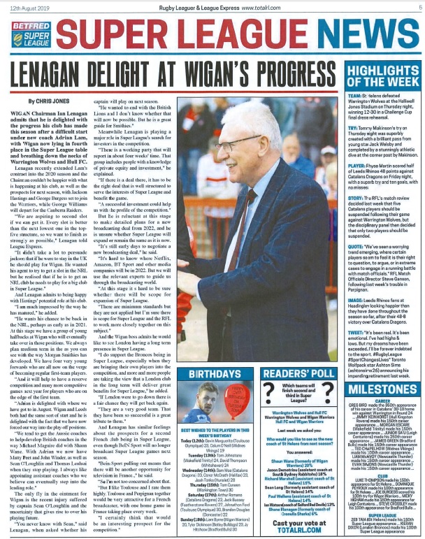 Par le biais d’une interview parue dans League Express lundi (12/08), Ian LENAGAN, Président des Wigan Warriors depuis 2007, a répété une nouvelle fois son souhait de voir le TO évoluer en Super League, aux côtés des Dragons Catalans.