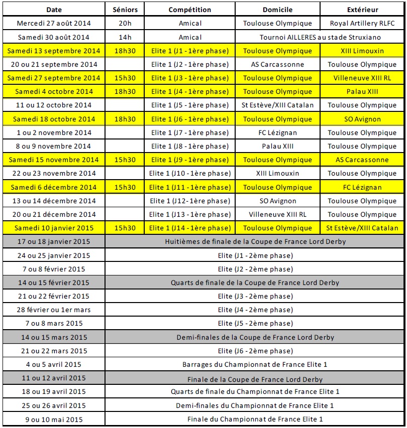 Le calendrier de la saison 2014-2015 du TO XIII :