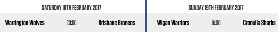 Cette année, Warrington, finaliste de la dernière Super League, recevra les Brisbane Broncos tandis que dimanche (19/02), ce seront les deux champions en titre qui se feront face : Wigan-Cronulla.