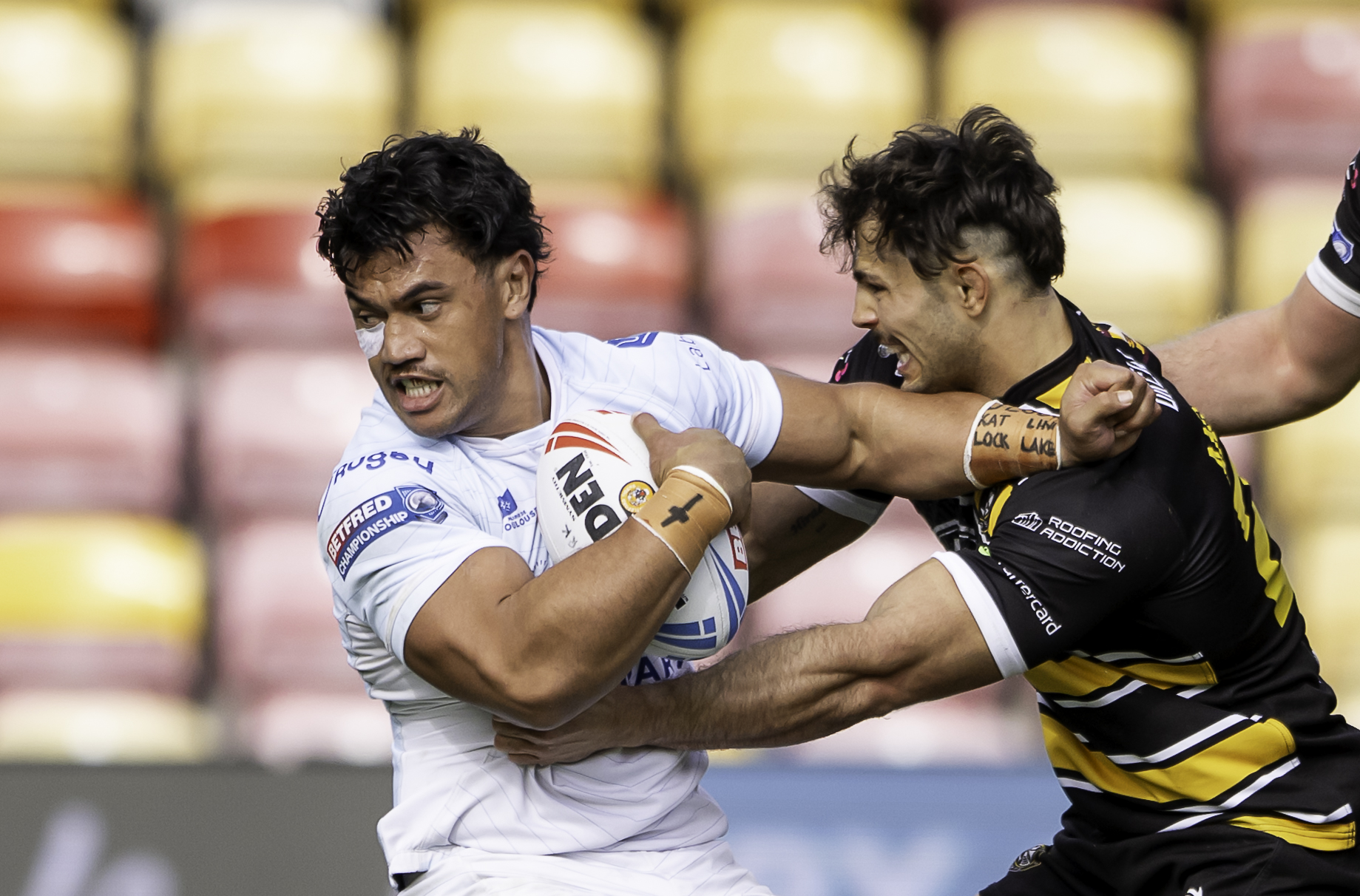 Picture by Allan McKenzie/SWpix.com – 05/10/2025 – Rugby League – Betfred Championship Grand Final – York Knights v Toulouse Olympique – LNER Community Stadium, York, England – Toulouse’s Reubenn Rennie is tackled by York’s Bailey Antrobus.